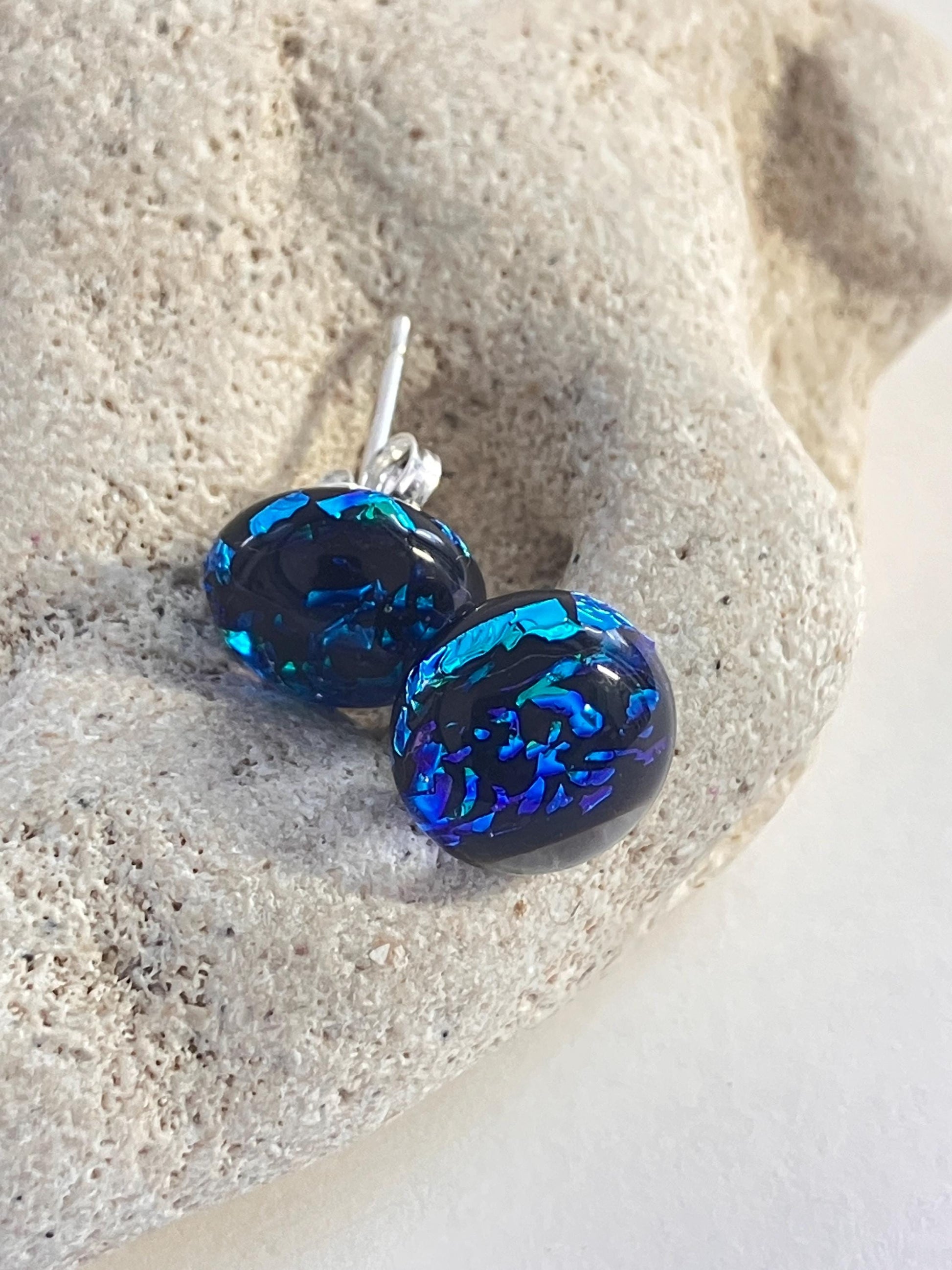 'Midnight' dichroic glass earrings - sterling silver studs.