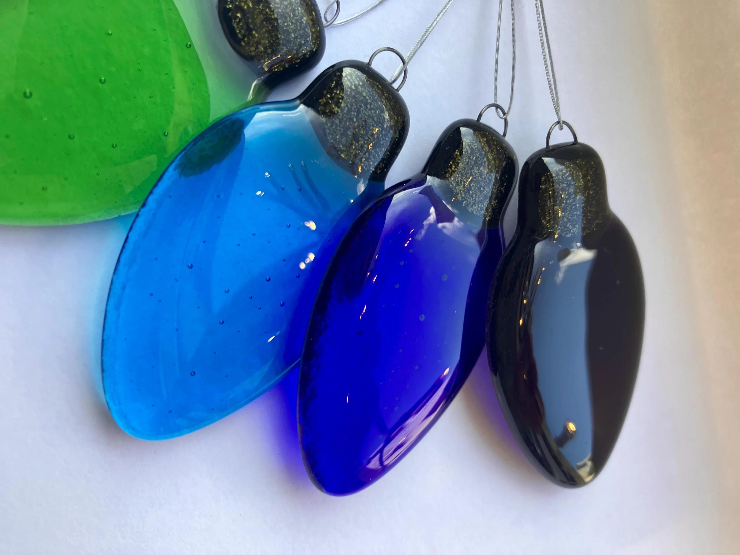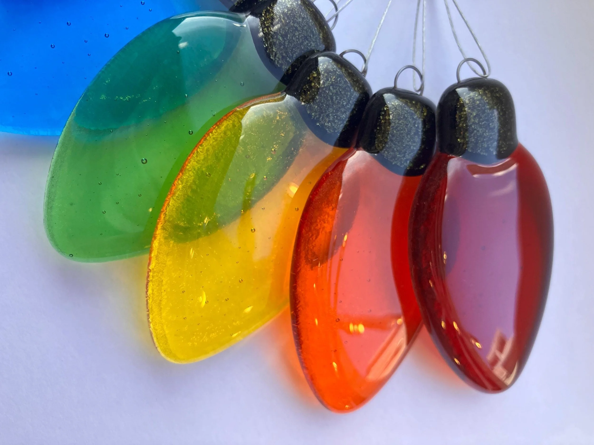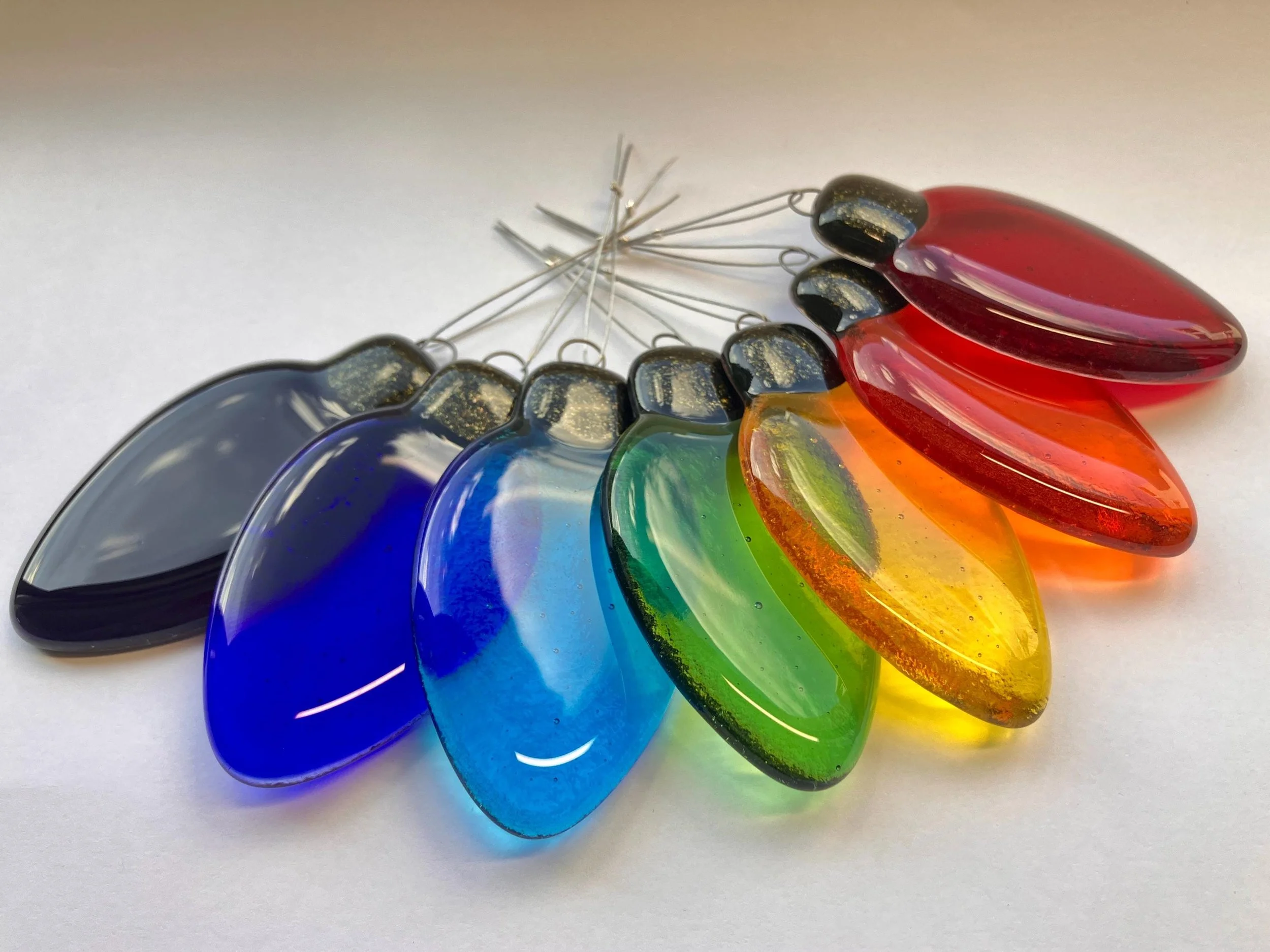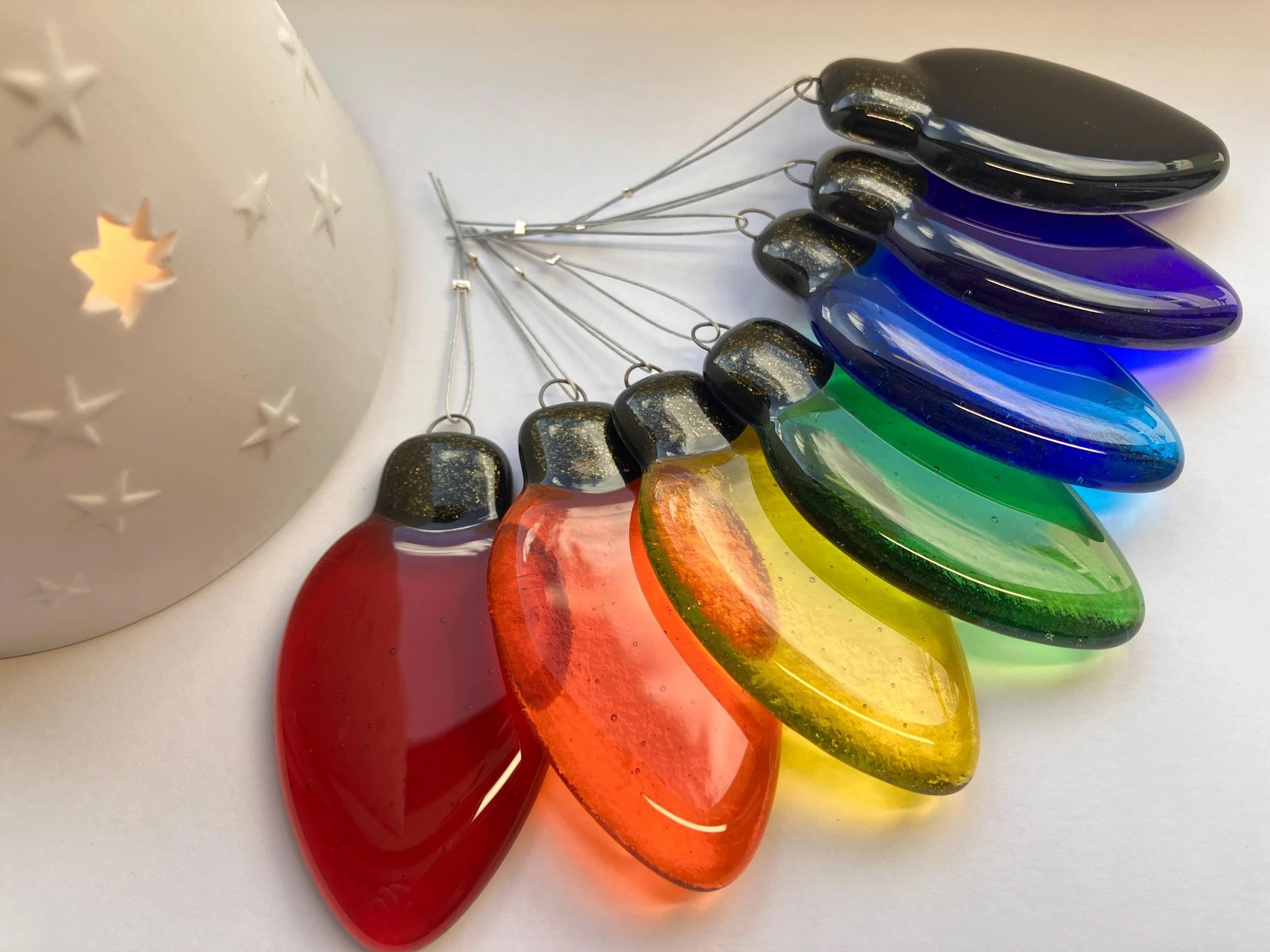 Each piece catches the light beautifully, glowing with rich, vibrant colour during the day and sparkling softly under evening lamps. Whether hung on a Christmas tree, strung along a mantle, or used to brighten a cosy reading nook, these little glass “lights” add a joyful pop of colour wherever they go.