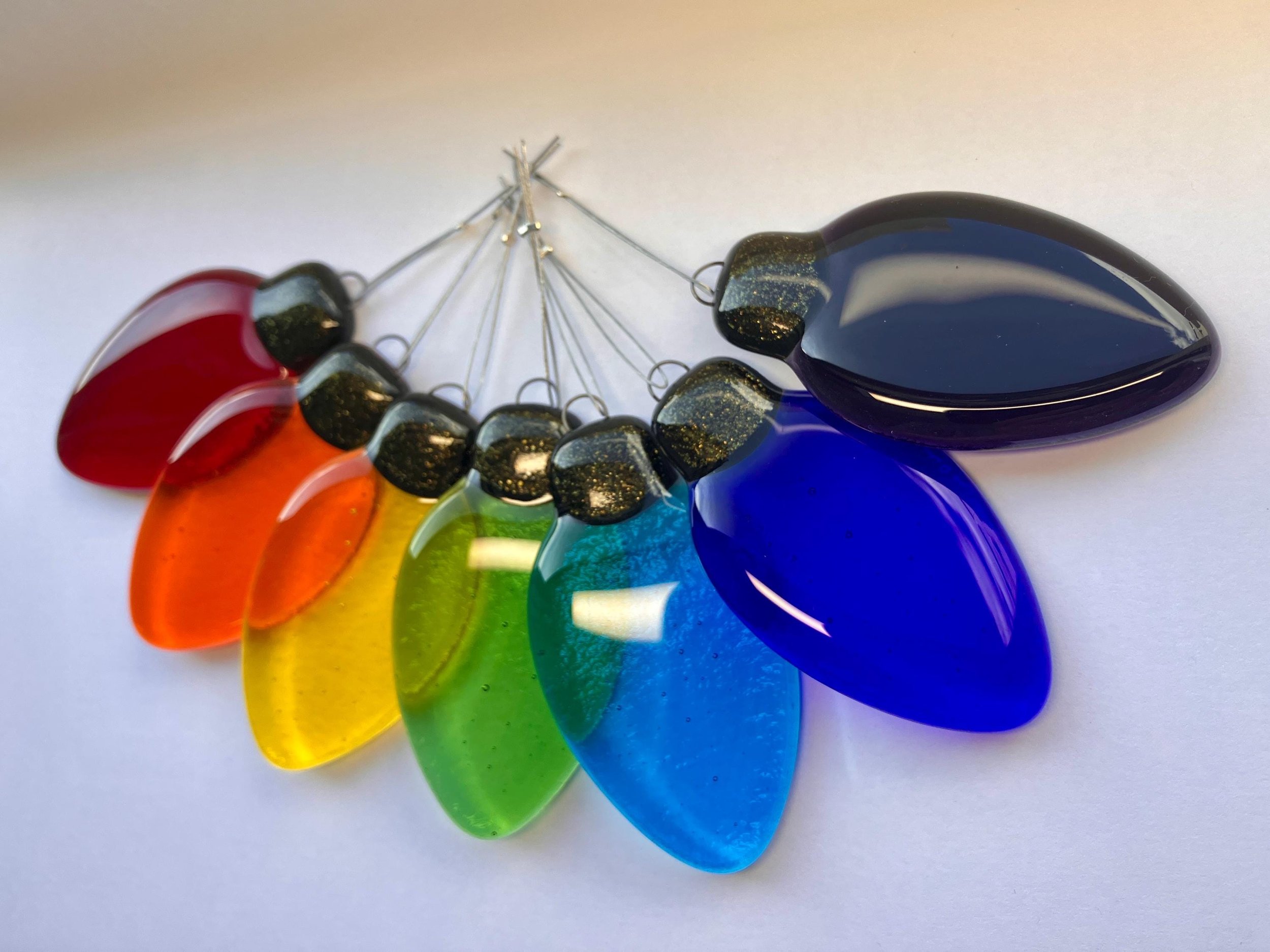 • Set includes 7 fused-glass fairy lights (each light measures c. 6.5 x 3.5cm and is strung on tiger tail). • Handmade in Western Australia • Kiln-fused for durability and brilliant colour • Perfect for gifting, decorating, or adding rainbow cheer to any space.