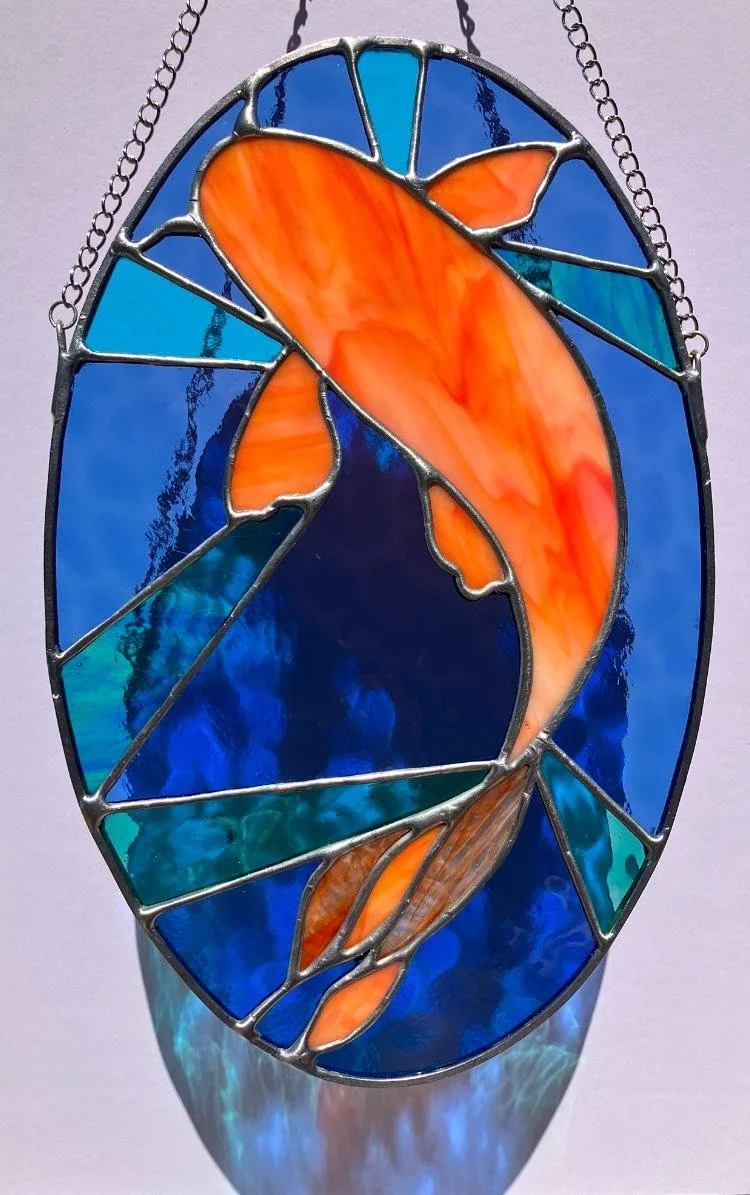 Stunning blue, green, turquoise and wispy orange glass crafted using the copper foil (Tiffany) technique into an elegant Japanese koi carp window hanging.